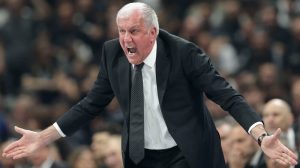 epa10573035 Partizan’s head coach Zeljko Obradovic reacts during the Euroleague basketball match between Partizan Belgrade and Panathinaikos Athens, Serbia, 14 April 2023. EPA-EFE/ANDREJ CUKIC